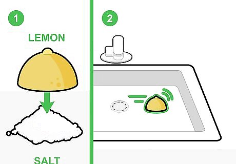 Slice a lemon in half. Dip the half in salt. Scrub the surface with the lemon half.