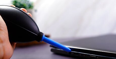 Blow 3-4 short bursts of compressed air into the jack. Take a can of air duster and hold the end near the opening of the jack. Use short bursts of compressed air to blow dust, dirt, and debris out of it. 3-4 short bursts should do the trick. You can find compressed air dusters at electronics stores and department stores, or by ordering it online.