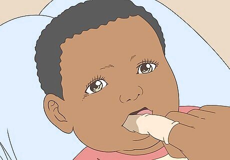 Gently put your finger in her mouth. Rub the upper and lower gum lightly. You do not need to do this more than one time or scrub the gum in any way. Don’t be surprised if baby tries to bite you. It is natural for your baby to bite your finger when you try to put your finger into her mouth. Reassure your baby with a smile. You may even want to talk her through the process. Though she may not understand at first, she will appreciate hearing your voice. You may also want to have baby's favorite toy on hand, to keep her entertained during the cleaning.