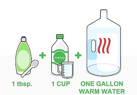 Use detergent and vinegar to clean dirty areas. Try a mixture of a tablespoon of dish-washing detergent, one cup vinegar, and one gallon of warm water. This mixture will work on many types of stains, including some stubborn greasy stains. Although mixing detergent and vinegar together is safe, be careful when mixing other household cleaners together. There are some combinations, such as bleach and vinegar, that can be toxic if mixed together.