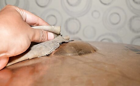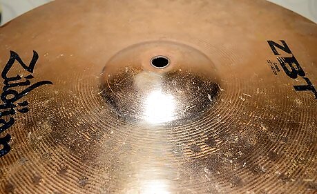 Apply some Brasso in the shape of a ring starting at the bell of the cymbal, or near the edge of the cymbal, if you would prefer to start there. Buff with the rag in circular motions. You can continue to apply to the bow of the cymbal, and work your way to the edge, or work your way into the bell, depending on what area you started on. You will start to see a black/brown/green/dark blue sludge on the cymbals, and your rag, which means you are thoroughly cleaning the dirt out of the grooves, and the cymbal itself. Replace your rag if necessary.