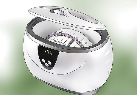 Try an ultrasonic cleaner. This is a professional cleaner made to clean certain items of jewelry. They are good for cleaning fragile jewelry like a gold chain or sterling silver earrings and are often used by professional jewelers. You can find ultrasonic cleaners online or in stores for $150 or less. You should not use ultrasonic cleaners on pearls, coral, ivory, or amber. You should also should not use the cleaner on precious gems like tanzanite, moonstone, fluorite, iolite, kunzite, lapis lazuli, opal, topaz, turquoise, and malachite.