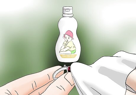 Use jewelry polish. If you want to use products that are made specifically to clean jewelry, you may try jewelry polish. Polish is good for high end jewelry that is delicate, such as an 18karat gold ring or a sterling silver necklace. You can find jewelry polish online or at specialty jewelry shops. Apply the polish with a clean, non-abrasive cloth and rub it in with long back and forth motions that follow the grain of the silver. When you use polish, do not rub it in circles on the jewelry, as this can cause tiny scratches. You can use a Q-tip to get at small, detailed areas on the jewelry.