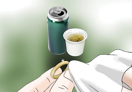 Use beer or club soda. Use a light ale to shine up your gold jewelry. Pour the beer on a soft cloth and rub it gently over the piece. Then, use a clean dry cloth to try. Do not use this method on gold that contains gemstones. You can also try soaking jewelry that contains diamonds, rubies, sapphires, and emeralds in club soda to brighten them up. Let them soak in a glass full of club soda overnight. Then, rinse them off in a glass of water and dry them with a clean soft cloth.