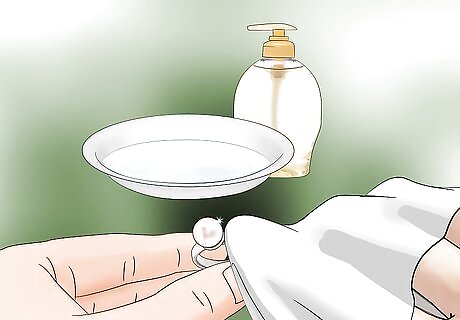 Try water and mild soap. Most fragile jewelry can be cleaned with a simple solution of mild dish soap and water. Use a soft brush, such as a soft-bristled toothbrush, or a soft lint-free cloth to wash the jewelry with the soap and water. Rinse off the jewelry in a glass of water, not the sink, and dry them well once they have been cleaned. Check the ingredients list on the soap to make sure it does not contain bleach, ammonia, or any harsh chemicals. These substances can all cause damage to jewelry. If you have jewelry that contains pearls, use a clean makeup brush to gently clean the pearls. You can use run the water and soap over the pearls and let them air dry on a towel.