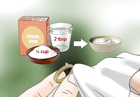 Apply baking soda and water. This method is good for silver or gold jewelry that does not contain pearls or gemstones. Combine ¼ cup baking soda and two tablespoons water to make a thick paste. Then, apply the paste to the jewelry with a damp sponge and gently rub to remove dirt or grime. Rinse the jewelry in a glass of water and use a clean soft cloth to dry. Do not use this method on costume jewelry as the acidity in the baking soda can damage it. Instead use another household product for costume jewelry.