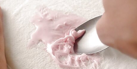 Scrape off dry excess slime with a knife or spoon. If the slime on your carpet has already dried, use a spoon or a knife to scrape off as much as you can, working from the outside in. Once you have scraped off as much as possible, use the vacuum hose to suck up the scraped bits. If you are using a knife, scrape slowly and carefully to avoid cutting the fibers on your carpet.