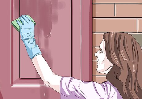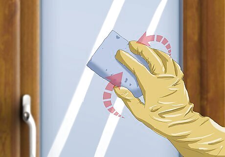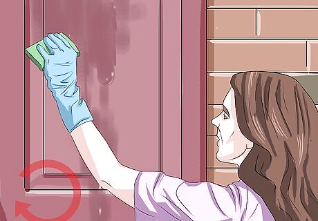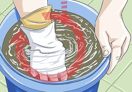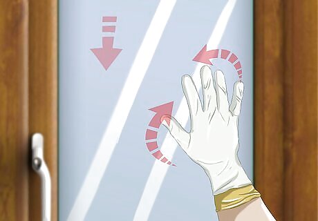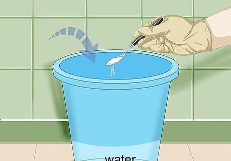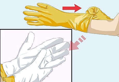Dip your gloves into the solution. Briefly submerge your gloves in the cleaning solution. Shake or wring out your gloves slightly over the bucket. This will prevent the solution from dripping everywhere as you clean.