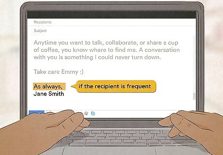 Choose this closer if you email the person frequently. Perhaps you email your company’s HR rep frequently, or you’re often in touch with a sales rep who works with your business. “As ever” wraps up your email in a friendly but still formal way. “As always” could be another great way to end an email with a frequent recipient.