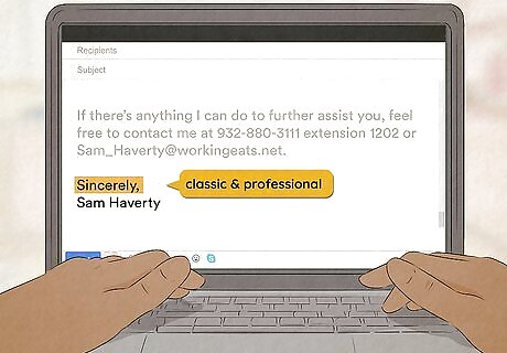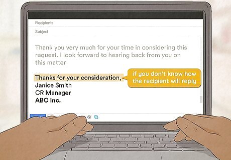 End your email with this sign-off if you’re requesting a favor. “Thank you in advance” is especially appropriate if you’re confident that the recipient is going to read or follow through with whatever you’re asking. A closer like “Thanks for your help” could also work in this scenario. “Thanks for your consideration” also works well, especially if you don’t know how the recipient will reply.