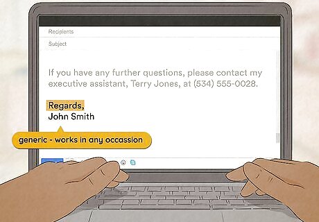 This professional closer works for any occasion. Whether you’re emailing a co-worker or a supervisor, “Kind regards” sets a polite, professional tone that doesn’t come across as casual or informal. “Kindest regards” is also a great option if you’d like your email to feel a little warmer. You can also conclude your emails with just “Regards.” It isn’t quite as friendly as “Kind regards” or “Kindest regards,” but it still sounds very professional.