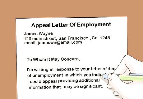 Appeal a denial. Every state allows you to bring an appeal if you feel you have been unfairly denied benefits. Your denial letter should tell you how to appeal. In some states, such as Iowa, you can appeal online. Other states will ask you to submit either a letter or an appeal form. Regardless of the method of bringing an appeal, remember that you must proceed quickly. States usually only give you 30 days to bring an appeal. Your chances of success will depend on the reason why you were denied. For example, if you were denied because you didn’t earn enough in your base period, then you will be lucky to win the appeal unless the office incorrectly calculated your wages. Some other denials are easier to appeal. For example, you might have been fired from your most recent job. If your employer claims your poor performance was intentional, you might be denied benefits. However, you can argue you just weren’t good at the job, and your poor performance wasn’t intentional or malicious.