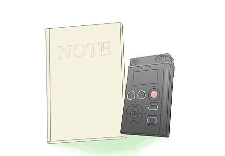 Carry a notebook and handheld recorder wherever you go.You never know when you're going to hit a creative stride. Unfortunately, a lot of the time, this happens to fall on the least convenient times where you're either far from an instrument or about to fall asleep. This is why it's a good idea to bring a notebook and/or sound recorder with you wherever you go. If you think of a great melody or rhythm, you can hum it into your mic and adapt it once you're by your piano again. Most cellphones have a recorder option. If you don't have a cellphone for this purpose, basic handheld recorders tend to be very affordable.
