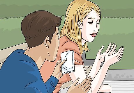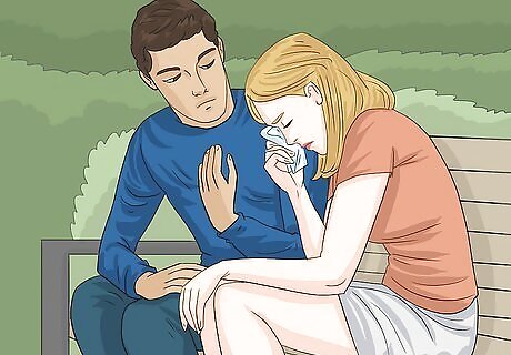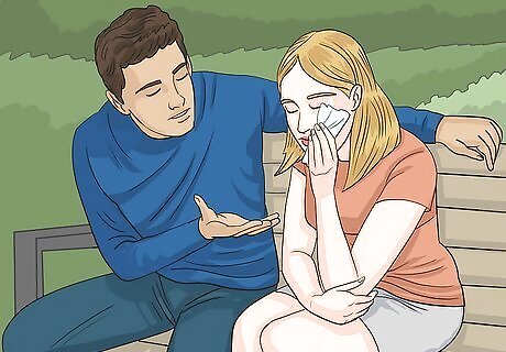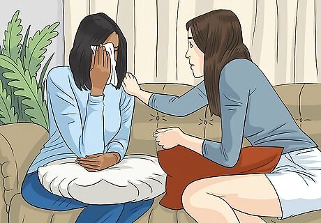 Let the person cry. Crying can increase their well-being by releasing pent-up emotions. Encourage your loved one to let their emotions out if they are inclined to do so. Simply sit with your friend while they cry or vent. You can hand them a tissue, rub their back (if appropriate), or encourage them to “let it out.” You can follow up by saying, “It’s okay to cry. Sometimes it's good to let those feelings out.” Avoid saying things like, “Please don’t cry.” This is sending the signal that it is not okay for them to let their emotions out and that you feel uncomfortable with their sadness.