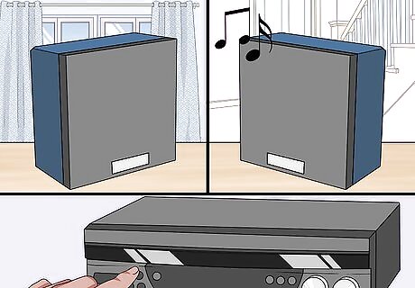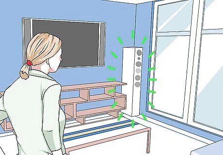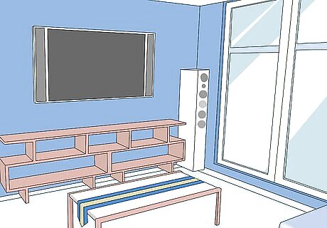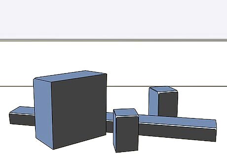 Determine where you want to place the speakers. This can help you determine how you will install the sound system, and whether you want to use wired or wireless speakers. Wired speakers are generally more reliable, but are much harder to install. Some wired speakers (such as wall or ceiling mounted speakers) may require a contractor to install. Here are some tips for placing your speakers: If possible, place them about 3 feet from the walls. This helps reduce the sound resonance of the room and reduce boomy bass. Place the speakers apart from one another and angle them in about 30 degrees inward towards the listening spot (unless the speakers are designed not to be angled). Do not place speakers on the floor, unless they are designed as floor-standing speakers.