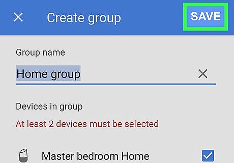 Save the group. To save the group on Google Home, tap Save in the upper-right corner. On Amazon Alexa, tap Create Group. For Sonos Controller, tap Done. To play music on a Google Home Group, locate the group in your list of your devices, tap Enable voice command and then tap Yes, I'm in to link the group to your Google account.