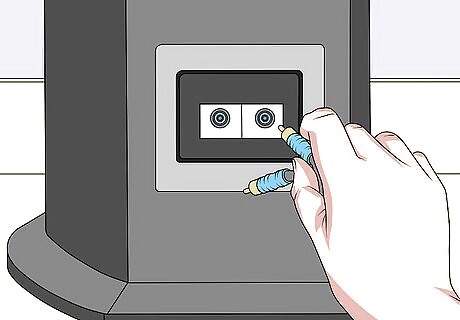 Connect the speakers. The main zone speakers can be connected directly to the back of the receiver. Unpowered speakers usually have a red and black (or white and black) wire for the positive and negative inputs. Stereo speakers will have two speaker inputs for the left and right speaker. A 7.1 Surround sound system will have seven speaker inputs for the speakers. It will have a left and right input for the front speakers, a left and right input for the surround (middle) speakers, a left and right input for the back speakers, as well as an input for the front center speaker, and an input for the sub-woofer. Speaker wires can be connected to the receiver using a spring clip or binding post on the back of the receiver. There are a few connectors that can be used to connect speaker wire. Below are the different connection types, and how to connect them your receiver. Bare Wires: Speakers that have bare wire do not have any type of connector. They just have a bare metal wire that sticks out of the end of the rubber wire coating. If your receiver has spring clips, simply press the clip down and insert the metal part of the wire and release the clip. For binding posts, unscrew the hexagon shaped collar, stick the metal wire in the hole, and screw the collar back on. Be sure to match the red and black color wires with the red and black spring clips or binding posts. Pin Connectors: Pin connectors are solid thin pins at the end of the speaker wire. To connect these to spring clips, simply press the clip down, insert the pin, and release the clip. To connect them to binding posts, unscrew the hexagon shaped collar, insert the pin in the hole, and screw the collar back on. Don't screw it too tightly. Make sure you match the red and black color wires with the red and black clips or pins. Spade Connectors: Spade connectors have two-pronged forks on the end of the speaker wire. These cannot be connected to a spring clip. To connect them to a binding post, unscrew the hexagon shaped collar, place the spade connector around the metal post, and screw the collar back on. Be sure to match the red and black wires with the red and black collars. Banana Plugs: Banana plugs have a thin pin that is wider in the center. They can come with a single banana plug on the end of each speaker wire, or a set of dual banana plugs on the end of both wires. Banana plugs cannot be connected to a spring clip. To connect then to to a binding post, simply plug the banana plug into the hole on the front of the collar. If your receiver has spring clips, but your speaker wires have a plug that cannot connect to the spring clips, you can cut the connector off and carefully strip the rubber wire coating to reveal the bare wire underneath.