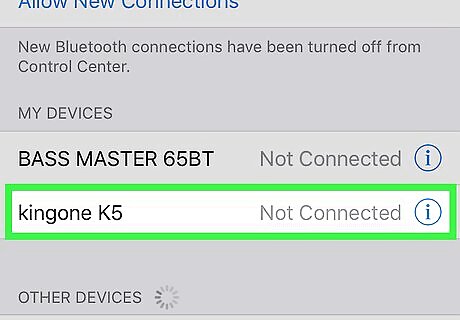 Open the Bluetooth Mac Bluetooth menu. Depending on the device you are using, the Bluetooth menu is located in a different part of the Settings menu. You can also click or tap the Bluetooth icon, which resembles a jagged capital "B" with a bracket on the back. Use the following instructions to access the Bluetooth menu on your specific device. Android Devices: On Android devices, the Bluetooth menu can be found under, "Connections", "Connected Devices", or "Network" depending on the make and model of your device. You can also access the Bluetooth menu by swiping down from the top of the screen, and tapping and holding the Bluetooth icon. Read "How to Connect Bluetooth Speakers to Android" to learn more about how to connect Bluetooth Speakers on Android devices. iPhone and iPad: On iPhone and iPad, the Bluetooth menu is near the top of the Settings menu. Read "How to Connect a Speaker to Your iPhone with Bluetooth" to learn more about how to connect a Bluetooth speaker to iPhone and iPad. PC & Mac: On PC, you can access the Bluetooth menu by clicking the Bluetooth icon in the lower-right corner of the system tray. Then click Add a Device. Then click Add Bluetooth or other device. On Mac, click the Bluetooth icon in the menu bar in the upper-right corner. Then click Open Bluetooth Preferences. Read "How to Connect a Bluetooth Speaker to a Laptop" to learn more about how to connect a Bluetooth speaker to a PC or Mac.