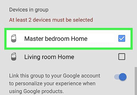 Select the speakers you want to group. The group option displays a list of all your smart speaker devices. Tap the checkbox next to all the speakers you want to add to a group.