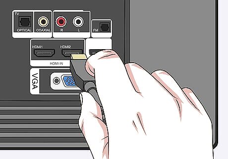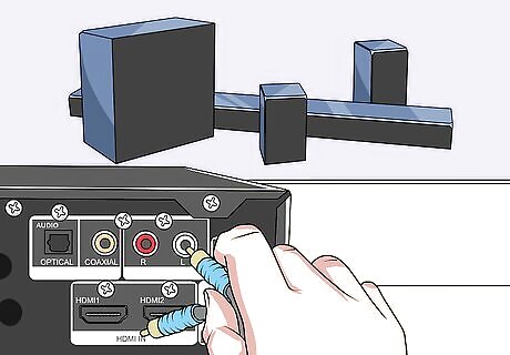 Connect your audio sources. Before connecting the speakers to your receiver, connect the output from your sources to their proper input on your receiver. The source inputs are typically labeled on the back of your receiver. For example, it may say "CD IN", "DVD IN", and so on. Check what input connections are available and connect the device using the proper cable. There are several cable types that can be used to connect an audio device. These cables are as follows: RCA Cables: Analog audio devices (such as a CD player, or turntable) can be connected using an RCA cable. These are a pair of red and white cables. Plug them into the matching red and white holes of the input. Coaxial Digital Cables: Coaxial Digital cables look similar to an RCA cable, but they have an orange color code. These are used to transmit digital audio signals from one device to another. Optical Digital Cables: Optical digital cables use a thin fiber-optic wire to transmit digital audio signals using light. They connect to a port that resembles the shape of a sideways house. HDMI: HDMI cables are used to transmit both high-definition video and audio over a single cable. They have a thin 3/4 inch metal plug on the end. They plug into the port that is the same shape as the metal plug.
