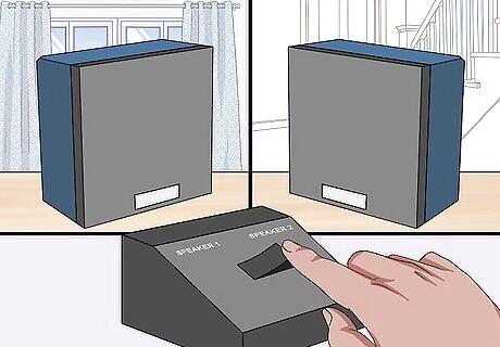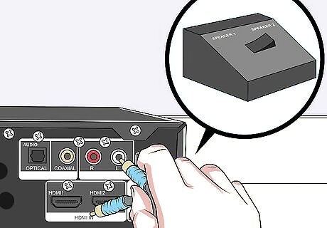 Connect a speaker selector switch (Optional). If you are interested in connecting more zones than what your receiver can support, the cheapest way to do so is to use a Speaker Selector Switch. This allows you to connect additional speakers for as many as 8 additional zones and switch between them using a switch. To connect a speaker selector switch, use an RCA cable to connect the audio out of the receiver or amplifier to the audio in on the speaker selector switch. Then connect the speakers to the speaker selector switch using spring clips or the binding posts on the speaker selector switch. Note: An external speaker selector switch will allow you to switch between zones, but will most likely not allow you to power more than one set of speakers at a time.
