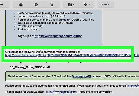 Retrieve the download link. Open the "Converted file from Zamzar" email from Zamzar, then click the long download link in the middle of the email. Doing so will open the download page.