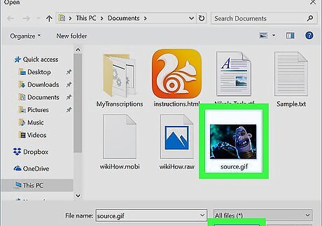 Select the GIF file you want to convert. Click the GIF in the file explorer window, and click Open to upload it. Your GIF file will now show up on the web page.