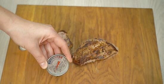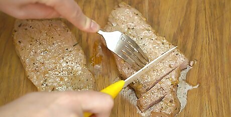 Use a meat thermometer to check the doneness. Take the steak out of the out pan and place it on a cutting board. Stick your meat thermometer into the thickest part of the steak so that you get the most accurate reading. Use the following guidelines to make sure your steak is to your liking: 120 °F (49 °C) for rare 130 °F (54 °C) for medium-rare 140 °F (60 °C) for medium 160 °F (71 °C) for well-done