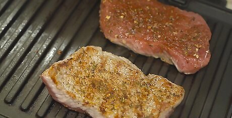 Cook the steaks on high heat for 1 minute per side to get a nice sear. Set a heavy skillet on the stove and turn your burner to high. Many people feel that cast iron pans are the only way to cook a good steak, but if you don’t have one, just use a good, sturdy skillet that is not non-stick. There’s no need to oil up your pan. Just place the steaks in the hot pan and cook for 1 minute. The high heat required will ruin a non-stick pan, so don't use one to sear your steak.