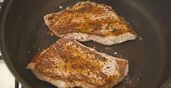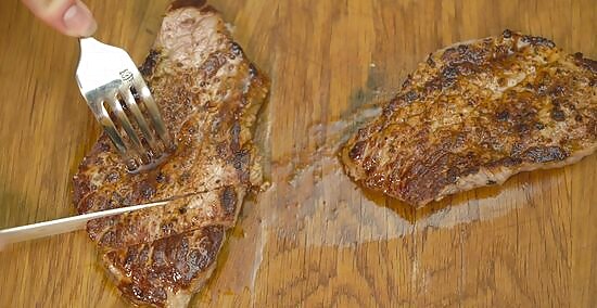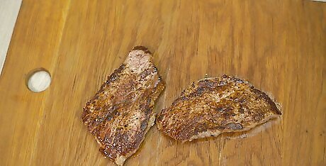 Let the meat rest for about 5 minutes to allow the juices time to settle. Remove the steaks from the pan and place them on a cutting board. Even though you might be starving, don't cut the steaks for 5 minutes. Letting them rest allows the juices to distribute so that your whole steak is tender and juicy.
