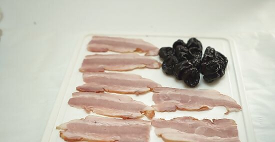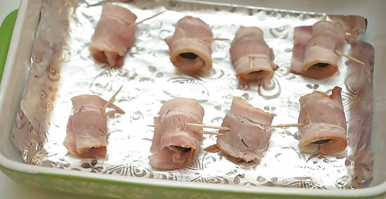 Roll the prune into the bacon and secure it with a toothpick. Tuck the top part of the bacon piece over the top of the prune and continue rolling it down until it reaches the end of the bacon. Stick a toothpick into the top of the bacon and prune roll to keep it all together. Without a toothpick, the bacon will probably unroll in the oven.