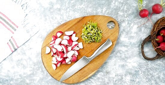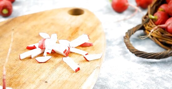 Cut the rest of the radishes into matchsticks. Place the remaining 1/4 cup (30 g) of sliced radishes on a cutting board. Cut the radishes into long thin strips the size of matchsticks.