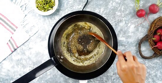 Combine browned butter with lemon juice. While the radishes cook, put 2 tablespoons (28 g) of unsalted butter in a small saucepan. Turn the heat to medium-high and melt the butter with a pinch of salt. Keep cooking the butter until it smells fragrant and turns golden brown. Turn off the burner and stir in 1 teaspoon (5 ml) of fresh lemon juice.