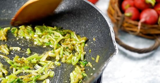 Sauté some of the radishes with the onion for 5 minutes. Pour 2 tablespoons (30 ml) of extra-virgin olive oil into a large saucepan and turn the heat to medium-high. Stir in 1 3/4 cups (200 g) of the sliced radishes and ½ cup (75 g) chopped onion. Stir and sauté the vegetables until the radishes become translucent and the onions soften. If you don't have extra-virgin olive, oil, you can use canola, vegetable, or coconut oil.