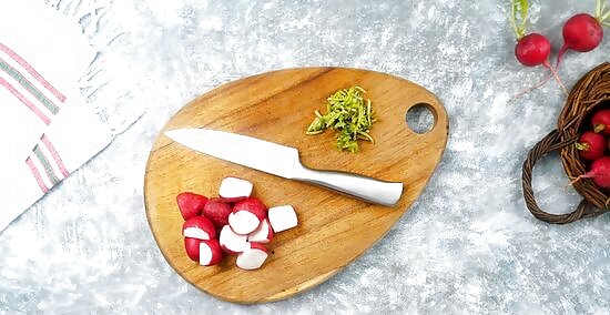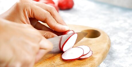 Chop the greens and slice the radishes into wedges. Use a sharp knife to chop the greens into coarse pieces. Set them aside and cut off 1/4 inch (1 cm) from both ends of the radishes. Discard the ends and slice the radishes into wedges that are 1/2-inch (12-mm) wide.