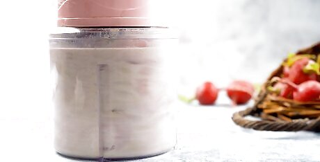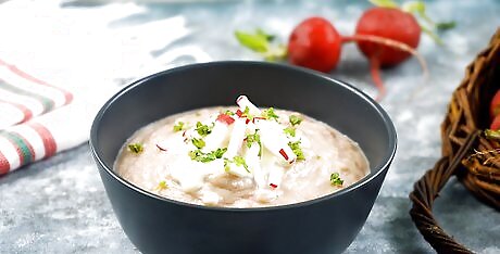Rinse and slice the radishes. Get out 2 bunches of radishes and rinse them to remove any dirt or grit. Set the radishes on a cutting board and trim off the greens. Set the greens aside to use as a garnish for the soup. Use a sharp knife to slice the trimmed radishes into 1/4-inch (1-cm) thick slices. You'll need 2 cups (230 g) of sliced radishes. Use your favorite radishes such as red, pink, purple, or daikon.