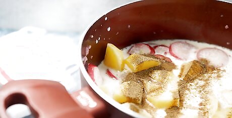 Chop 1 potato and add it to the saucepan with milk, salt, and pepper. Peel 1 medium Yukon Gold potato. Cut the potato into cubes that are 1-inch (2.5-cm) wide and add them to the saucepan. Stir in 2 cups (475 ml) of low-fat milk, ½ teaspoon (2.5 g) of salt, and ½ teaspoon (1 g) of ground pepper.