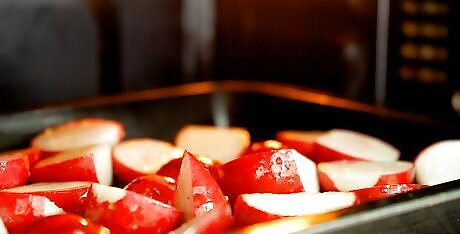 Roast the radishes for 18 minutes. Put the baking sheet in the oven and roast the radishes until they're tender in the center and a little crispy on the outside. Stir the radishes 1 to 2 times while they roast to ensure that they cook evenly. To test if the radishes are cooked, insert a fork or knife into the center of one. You should be able to pull it out easily.