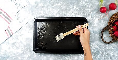 Preheat the oven to 450 °F (232 °C) and grease a baking sheet. Get out a rimmed baking sheet and drizzle it with a little olive oil. Use a pastry brush to evenly coat the bottom of the sheet with the oil to prevent the radishes from sticking. You could also use canola, vegetable, or coconut oil.