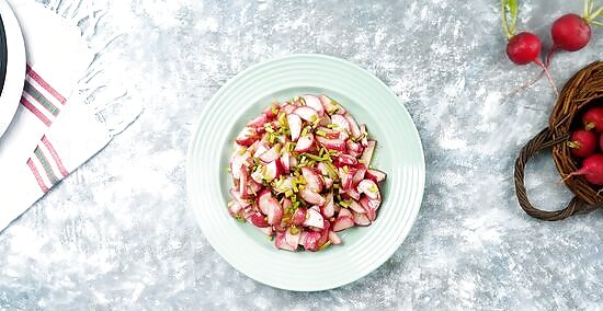 Rinse and trim the greens from the radishes. Rinse 4 bunches of radishes under cold water to remove any dirt or grit. Dry the radishes and greens on a kitchen towel and then place them on a cutting board. Cut off the greens and separate them from the radishes. Use red, pink, purple, or daikon radishes for this recipe.