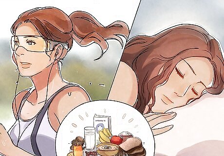 Take care of yourself. PTSD is both emotionally and physically draining. While you are coping with surviving a rape, it is important to take care of yourself. This includes trying to remain physically healthy. Eat a healthy diet. Try to get balanced amounts of lean proteins, complex carbohydrates, and plenty of colorful vegetables. Don't forget breakfast. Starting your day off with a nutritious meal can help give you the energy you need to make it through a tough day. Exercise. Physical activity is known to reduce stress and boost your mood. Try to get at least 30 minutes of exercise most days of the week. Try to rest. It can be difficult to sleep when you are dealing with PTSD, but rest will help speed the healing process. Keep your room as cool and quiet as possible. Try to go to bed at the same time each evening and wake up at the same time each morning.