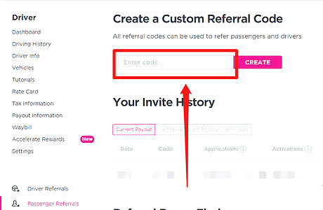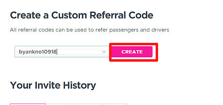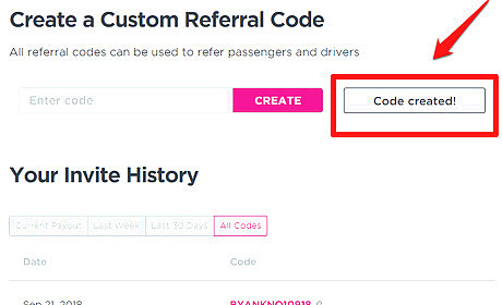 Click the "Create" button. If you see your code pop up in the customized codes list underneath this section, you've done it! Share the code with potential passengers.