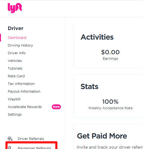 Click on the Passenger Referrals link in the bottom-left corner of the screen.