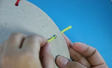 Take a colorful length of yarn or thread and begin to loop-stitch around the edge of the plate. It is helpful to smudge some glue on the leading tip of the yarn. When the tip dries, it is stiff and is easier to thread through the holes.