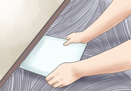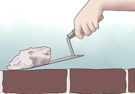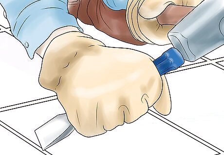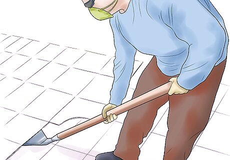 Remove any mortar (if used) from around the slab by using a narrow bladed masonry chisel (if the mortar is in poor condition, an old strong screwdriver may do). Take care not to damage the edge of the neighbouring slabs. For a broken slab, chisel a hole into the broken part of the slab, then carefully lever out the pieces until all are removed.