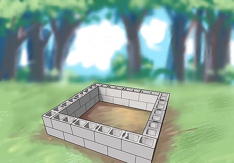 Dig a trench. At least 100mm/3.93 inches of well firmed hardcore will be needed under the concrete so dig out a trench 180-200mm/7-7.8 inches deep where the wall is to be. Use pegs and string to mark out the trench. Drive 300mm/11.8 inch long wooden pegs into the centre of the trench at 1200mm/47.2 inch to 1800mm/70.8 inch intervals so that they project from the base up to a point about 25mm/0.9 inches below ground level. Use a spirit level and straight edge to ensure the tops of the pegs are level. They will serve as a guide when the concrete is laid, indicating the surface level. Infill the trench with well compacted hardcore then concrete up to peg level. Leave the concrete to set. Note: Cover with polythene sheeting to keep any rain off, and also to prevent it drying out too quickly in hot weather. Stretch a string line along the set concrete where the front edge of the wall is to finish. This will ensure that the first course is laid straight. The blocks are always laid in the centre of the concrete. Starting at one end of the wall spread mortar to a depth of about 12mm/0.47 inches behind the string line. The mortar should be workable but not sloppy. Lay the first end or corner block in place and tap down gently, compressing the mortar to about 9mm/0.35 inches. Check that it is level.