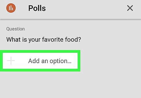 Add multiple-choice answers. If you don't want your question to remain open-ended, tap + Add an option… to add a possible answer. Then, tap it again to add another answer. Repeat this step until you've added all possible answers.