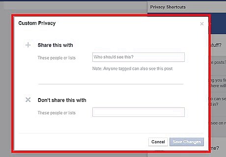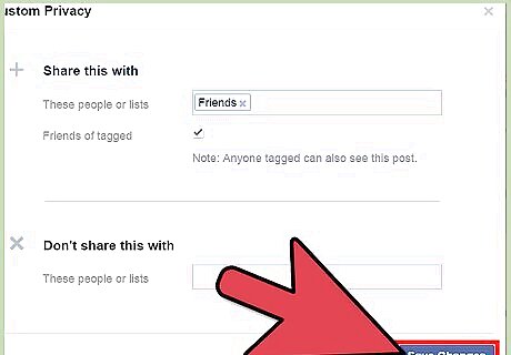 Create the privacy list. The “Custom privacy” window will appear. There are two text boxes on the window. The first one is for friends and friends lists who can see all your future posts on Facebook. The second one is for friends and friends lists who won't be able to see all your future posts on Facebook. Fill in boxes to determine which of your friends can see your posts.