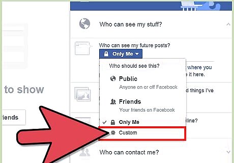 Begin a custom list. Under the option for “Who can see my future posts?” click the drop-down list. Your current friends lists and generic Facebook categories, like Public and Friends, will be included in the drop-down values. Click on “Custom.”