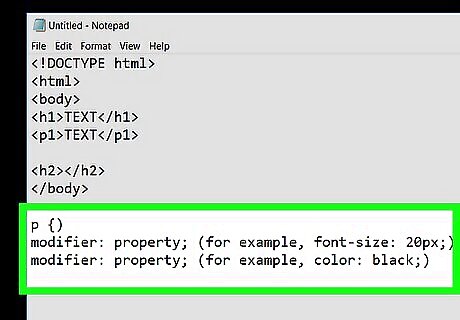 Understand how CSS works. You use CSS to change the appearance of an HTML element (e.g., a paragraph). CSS is typically written in the following line-by-line format: element tag { (for example, p {) modifier: property; (for example, font-size: 20px;) modifier: property; (for example, color: black;) }